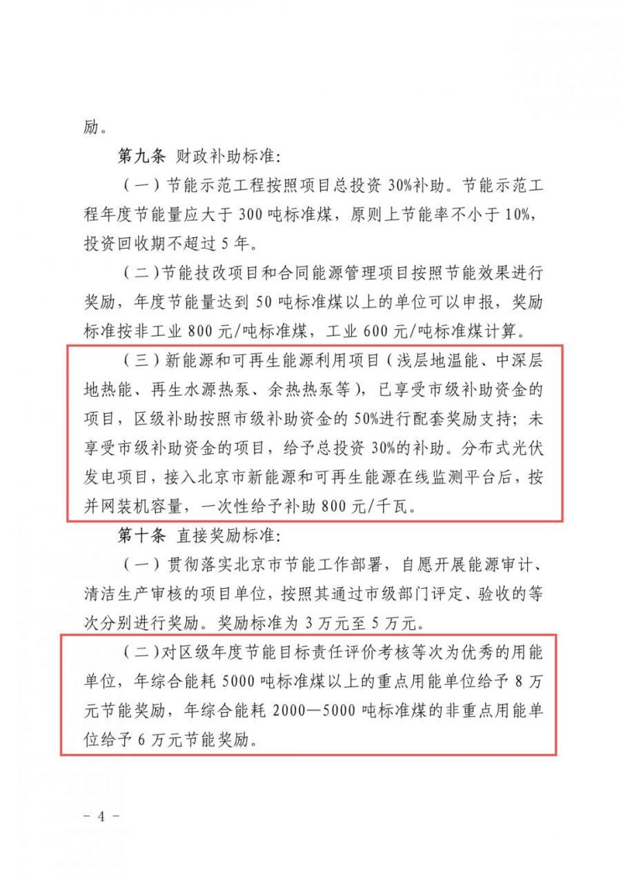 通知明確:新能源和可再生能源利用項目已享受市級補助資金的項目,區(qū)級補助按照市級補助資金的50%進行配套獎勵支持;未享受市級補助資金的項目,給予總投資30%的補助。分布式光伏發(fā)電項目,接入北京市新能源和可再生能源在線監(jiān)測平臺后,接并網裝機容量,一次性給予補助800元/千瓦。
