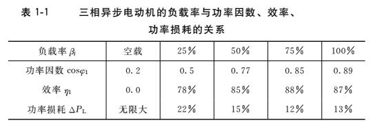 三相異步電動機的負載率與功率因數、效率、功率損耗的關系見表1-1。