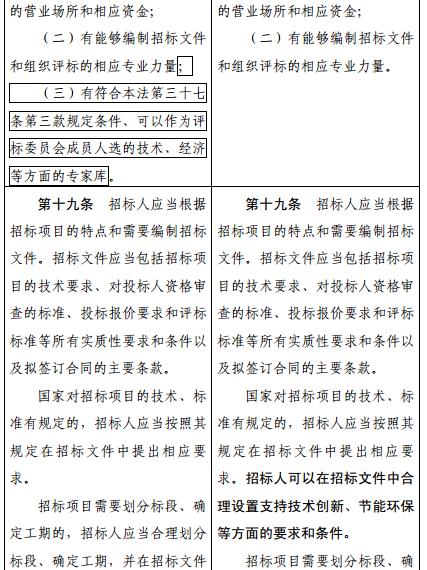 在對招標(biāo)法第19條的修改中,在保留原有“國家對招標(biāo)項(xiàng)目的技術(shù)、標(biāo)準(zhǔn)有規(guī)定的,招標(biāo)人應(yīng)當(dāng)按照其規(guī)定在招標(biāo)文件中提出相應(yīng)要求”內(nèi)容的基礎(chǔ)上,增加了“招標(biāo)人可以在招標(biāo)文件中合理設(shè)置支持技術(shù)創(chuàng)新、節(jié)能環(huán)保等方面的要求和條件”的內(nèi)容,加重了創(chuàng)新和節(jié)能環(huán)保在招投標(biāo)中的考量力度。