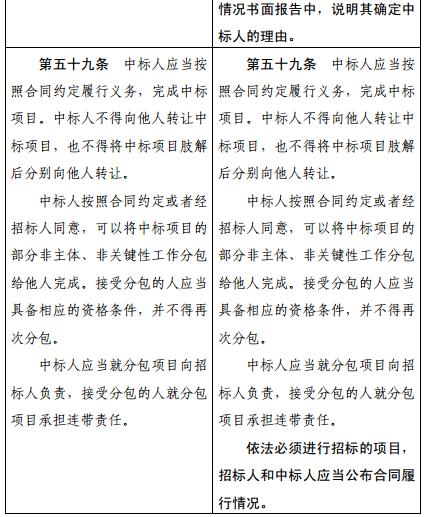 二、第五十九條增加一款,作為第四款:“依法必須進(jìn)行招標(biāo)的項(xiàng)目,招標(biāo)人和中標(biāo)人應(yīng)當(dāng)公布合同履行情況。”