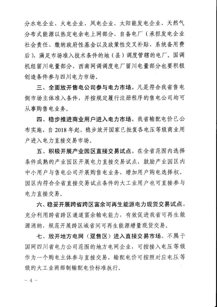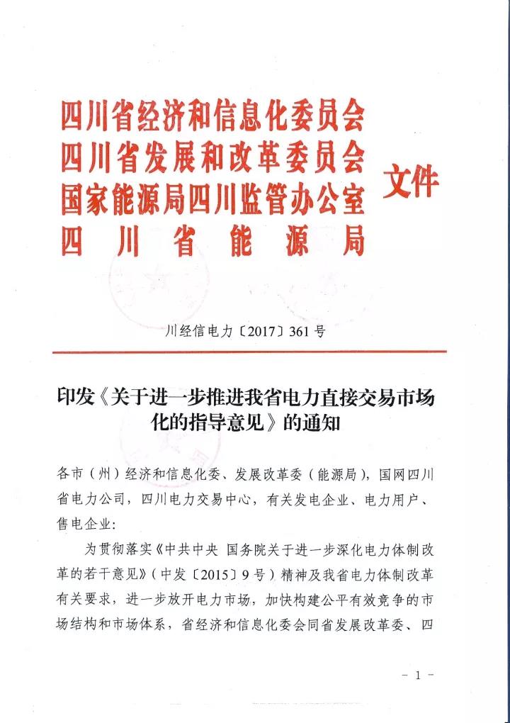 四川省經(jīng)信委、四川省發(fā) 改委、國家能源局四川監(jiān)管辦、四川省能源局日前聯(lián)合下發(fā)了《關(guān)于進(jìn)一步推進(jìn)我省電力直接交易市場化的指導(dǎo)意見》(以下簡稱“意見”)。意見中稱,將規(guī)范完善直購電的相關(guān)扶持政策,擴(kuò)大發(fā)電企業(yè)參與電力市場范圍,全面放開售電公司參與電力市場,穩(wěn)步推進(jìn)進(jìn)商業(yè)用戶進(jìn)入電力市場,積極開展產(chǎn)業(yè)園區(qū)直接交易試點,穩(wěn)妥開展跨省跨區(qū)富余可再生能源電力現(xiàn)貨交易試點,放開地方電網(wǎng)(躉售區(qū))進(jìn)入直接交易市場,有序推進(jìn)其他特殊行業(yè)企業(yè)完全電力市場化。詳情如下: