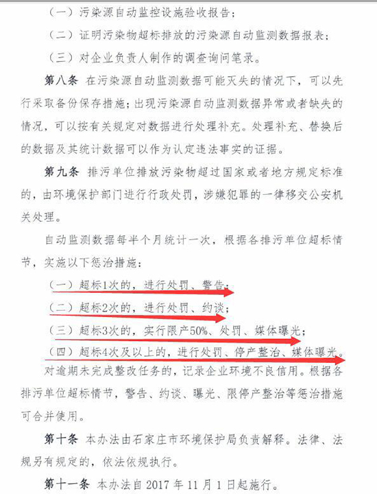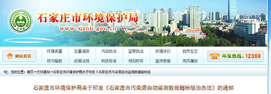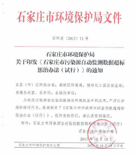 近日河北石家莊市環(huán)保局印發(fā)《石家莊市污染源自動監(jiān)測數(shù)據(jù)超標懲治辦法(試行)》(以下簡稱“辦法”)。辦法明確,企業(yè)污染源自動監(jiān)測數(shù)據(jù)出現(xiàn)超標將被處罰,超標4次及以上,將停產(chǎn)整治。辦法自11月1日起施行。