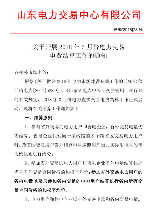 日前,山東電力交易中心發(fā)布《關(guān)于開展2018奶奶3月份電力交易電費(fèi)結(jié)算工作的通知》(以下簡(jiǎn)稱“通知”)。通知中稱,參與省外交易的電力用戶和售電企業(yè),省外交易電量?jī)?yōu)先結(jié)算。參加省外交易電力用戶的省內(nèi)電量以及只參加省內(nèi)交易的電力用戶結(jié)算執(zhí)行省內(nèi)所有交易合同價(jià)格的加權(quán)平均價(jià)。詳情如下: