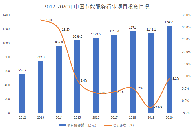 近年來,中國節(jié)能服務能效項目穩(wěn)健開展,2020年,節(jié)能服務行業(yè)項目投資額約為1245.9億元,同比上漲9.2%。