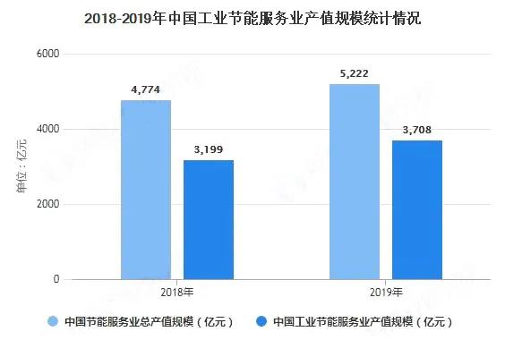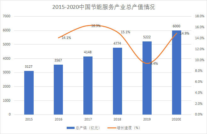 近年來,節(jié)能服務產業(yè)總產值不斷增長,呈逐年上漲趨勢。中國節(jié)能協(xié)會數據顯示,2019年我國節(jié)能服務產業(yè)總產值達5222億元,同比增長9.38%。根據《“十三五”節(jié)能環(huán)保產業(yè)發(fā)展規(guī)劃》,到2020年節(jié)能服務業(yè)總產值達到6000億元。我國節(jié)能服務行業(yè)潛力巨大。