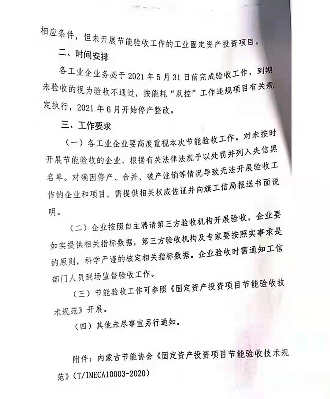 烏拉特前旗:對全旗工業(yè)企業(yè)開展節(jié)能審查驗收,對期限內驗收不通過的企業(yè),按能耗“雙控”工作違規(guī)項目有關規(guī)定執(zhí)行停產(chǎn)整改。