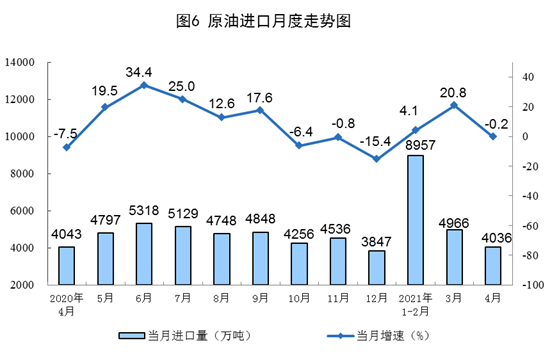 1-4月份,生產(chǎn)原油6563萬(wàn)噸,同比增長(zhǎng)1.9%,比2019年1-4月份增長(zhǎng)3.9%,兩年平均增長(zhǎng)1.9%;加工原油23210萬(wàn)噸,同比增長(zhǎng)14.2%,比2019年1-4月份增長(zhǎng)10.3%,兩年平均增長(zhǎng)5.0%。
