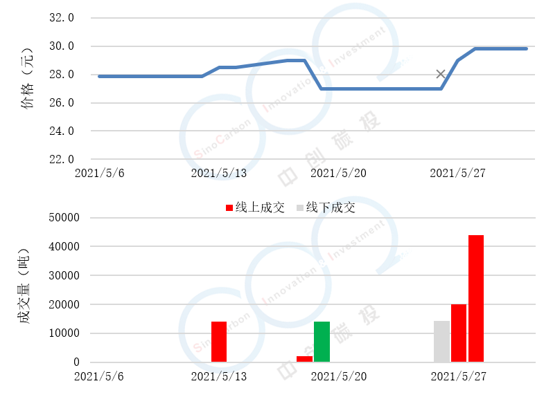 - 線上成交價最低為27.00元,最高為29.80元,平均碳價為29.00元。