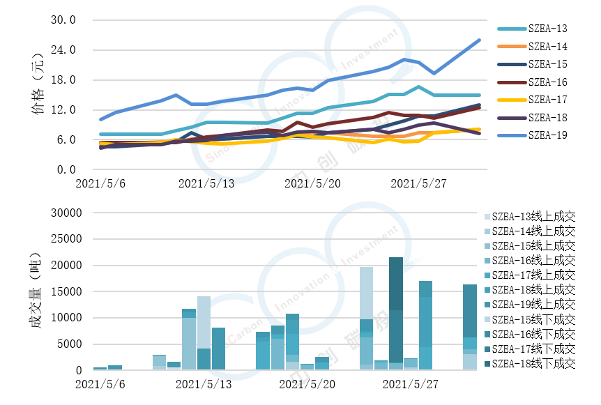 - 線上成交價最低為4.39(產(chǎn)品SZEA-18),最高為25.99元(產(chǎn)品SZEA-19),平均碳價為10.08元(平均碳價為各產(chǎn)品價格加權得出)。