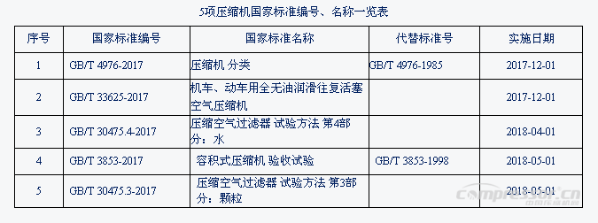 2017年第11號、第23號、第29號中華人民共和國國家標(biāo)準(zhǔn)公告,由國家質(zhì)量監(jiān)督檢驗(yàn)檢疫總局、國家標(biāo)準(zhǔn)化管理委員會批準(zhǔn)發(fā)布了共5項(xiàng)壓縮機(jī)國家標(biāo)準(zhǔn),具體內(nèi)容見表: