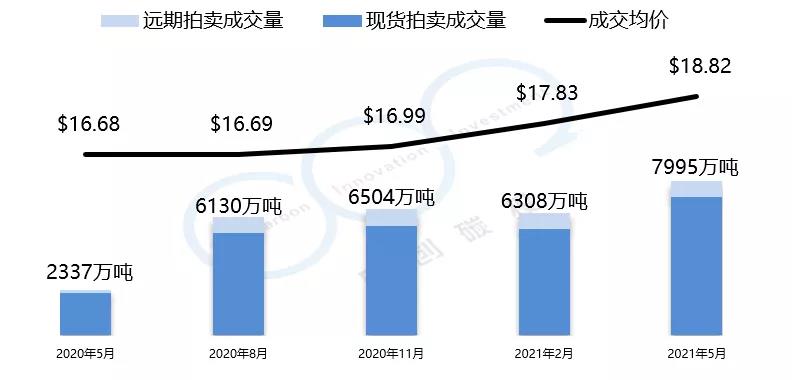 加州-魁北克碳市場的初始配額發(fā)放以拍賣為主,每個(gè)季度舉行一次拍賣。2021年5月的第27次拍賣均價(jià)與總成交量創(chuàng)歷史新高。拍賣均價(jià)為18.82美元,較上一季度漲幅為5.6%,總成交量為7995萬噸。以下是由中創(chuàng)碳投統(tǒng)計(jì)的加州-魁北克碳市場近一年的交易情況。