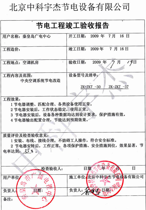 安裝調(diào)試驗(yàn)收,節(jié)能效率達(dá)到35%,節(jié)能效果非常明顯,投資回報(bào)期不到兩年,為秦皇島市廣播電視局得到了很好的經(jīng)濟(jì)效益和社會效益。