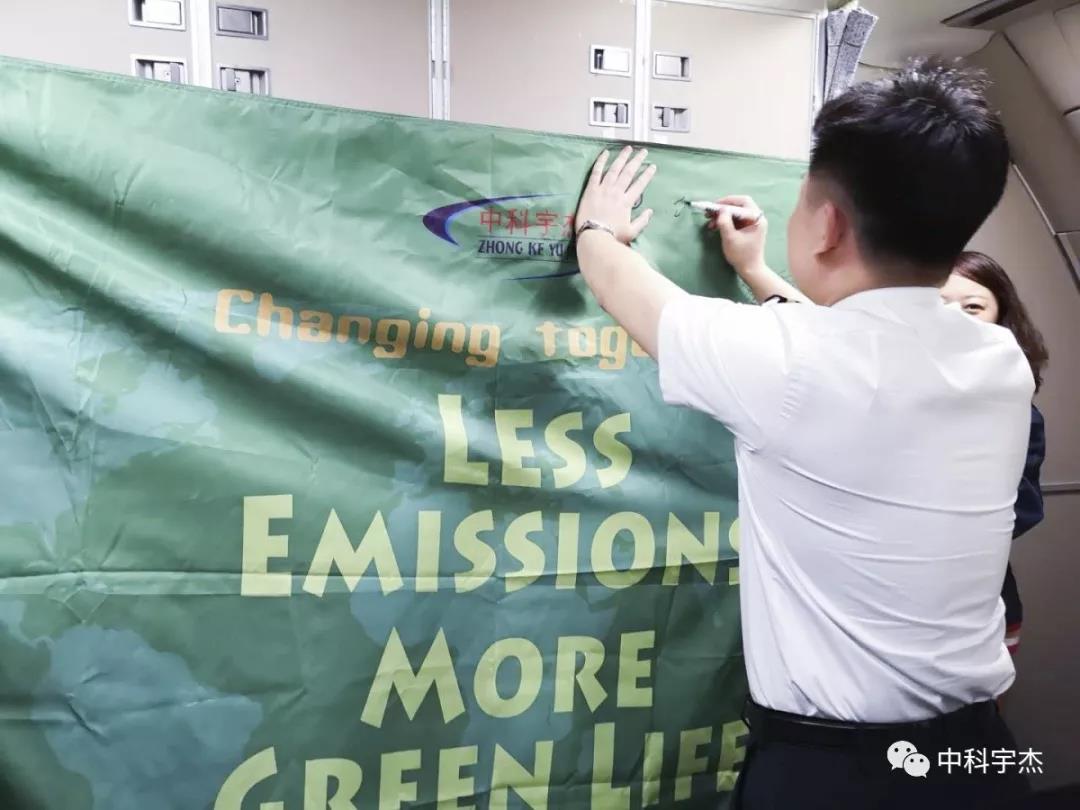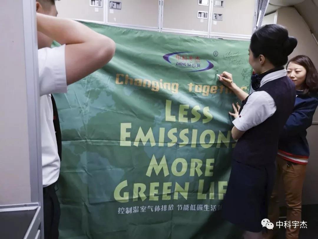 ?本次公益宣傳愛心傳遞活動得到國航CA877機組成員大力支持,據(jù)乘務長介紹國航一直注重綠色低碳,國航機組成員作為節(jié)能減排的倡導者,保護環(huán)境,人人有責,通過參與中科宇杰本次活動,呼吁全球共同參與,傳遞正能量,積極參與的溫室氣體減排行動。“Less Emissions More Green Life”活動,并在的綠色宣傳旗上簽字,節(jié)能低碳我先行,共同參與,共同倡導,節(jié)能低碳生活新風尚。